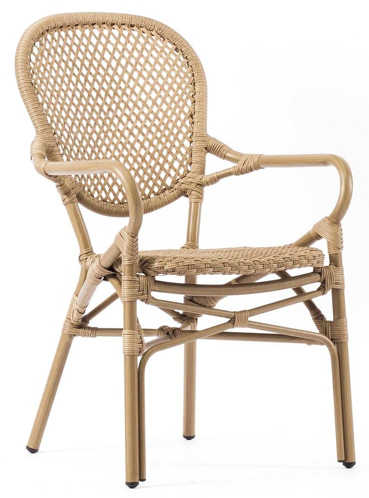 Плетенные стулья из ротанга для летней террасы, веранды, ресторана, кафе, бара, пиццерии, патио, сада, отеля, гостиницы. Каркас стула из алюминия, плетение искусственный ротанг бежевого цвета, мягкая подушка бежевого цвета Размеры: Ширина 56/45 см, Глубина 66/46 см, Высота 80 см, Высота сиденья 32-40 см. Ширина ножек 32-49,5 см. Высота до подлокотников 65 см. Стулья плетеные подойдут для интерьера в стиле экостиль, прованс, средиземноморский стиль,