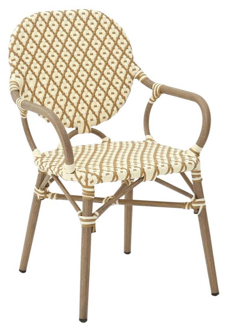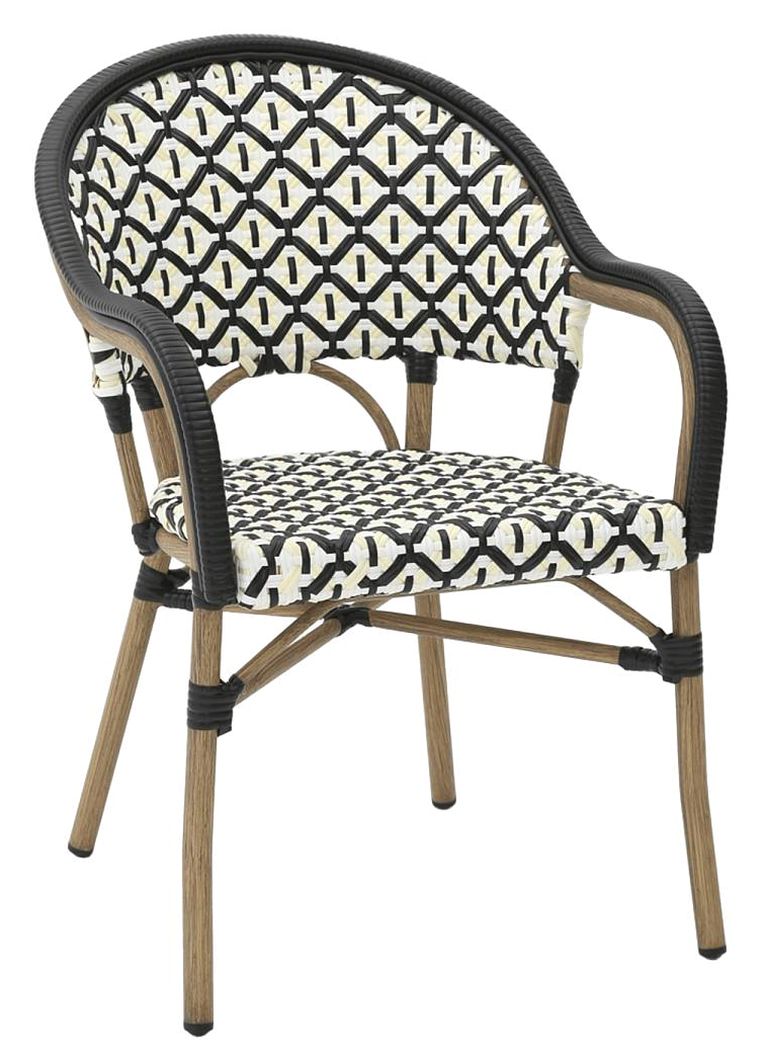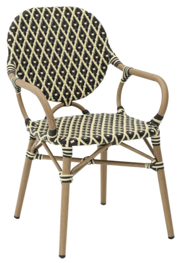 Плетенный стул во французском стиле для кафе, ресторана, веранды, террасы, отеля, гостиницы, дачи, летней площадки, загородного дома. Каркас металл бежевого цвета имитация под бамбук, плетение искусственный ротанг черно-белого цвета. Размеры: Ширина 56/44 см. Высота 83 см. Глубина 59/46 см. Высота сиденья 45 см. Высота до подлокотников 67,5 см, Вес 4 кг.