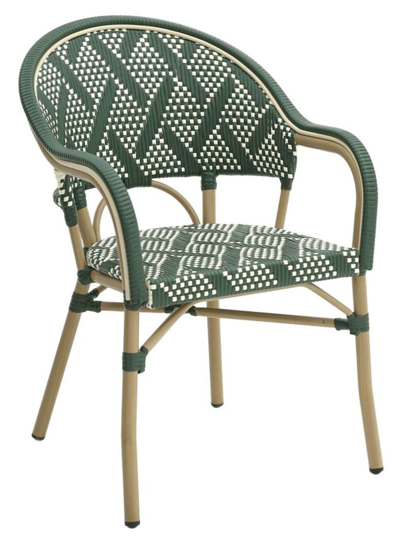 Плетеные стулья из ротанга во французском стиле для кафе, ресторана, веранды, террасы, отеля, гостиницы, дачи, летней площадки, загородного дома, коттеджа, сада. Стул на алюминиевом каркасе коричневого цвета, плетение из искусственного ротанга зелено-бежевого цвета. Размеры: Ширина 58 см, Глубина 61 см, Высота 87 см, Вес 8,5 кг. Стулья плетеные для интерьера в стиле прованс, стиль бохо, классика, экостиль, средиземноморский стиль.