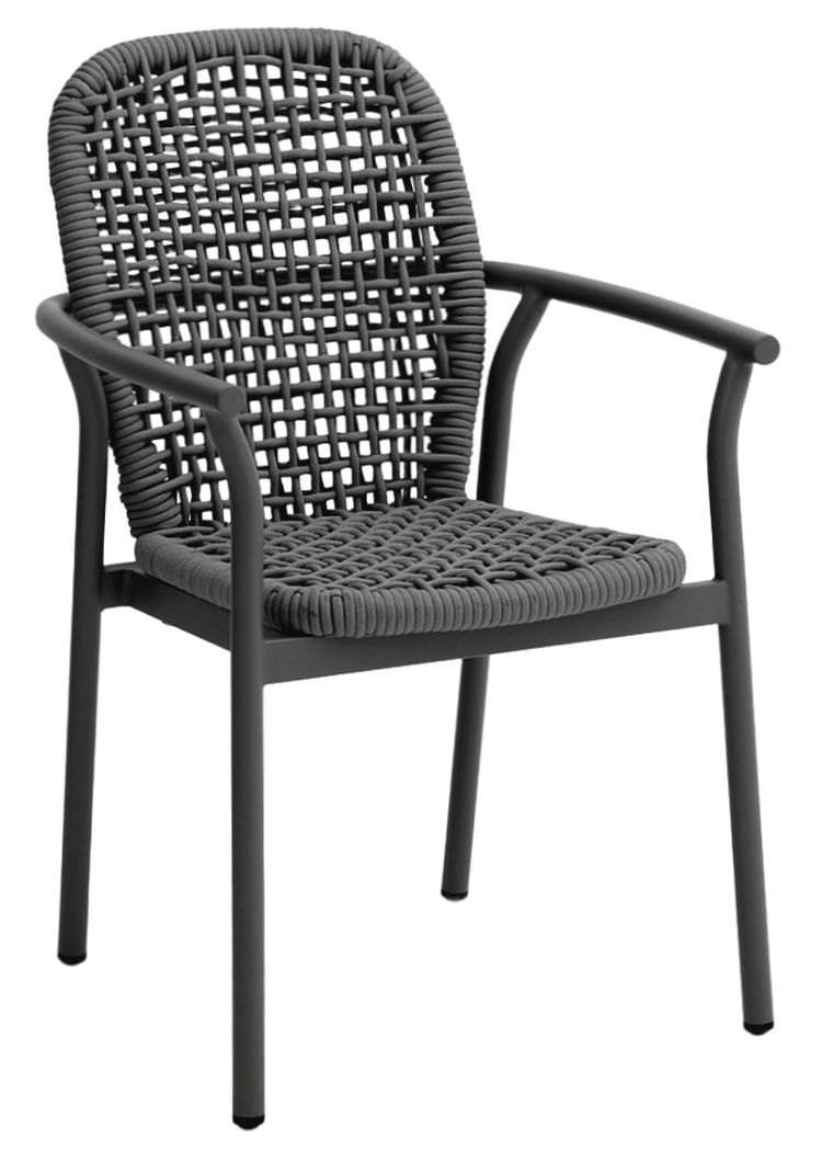 Дизайнерский плетенный стул роуп для летнего кафе, веранды и террасы. Каркас металлический темно-серого цвета, веревочное плетение роуп темно-серого цвета. Мягкие подушки серого цвета в комплекте. Размеры: Ширина 63/46 см. Глубина 62/48 см. Высота 77 см, Высота сиденья 46 см, Высота до подлокотников 73 см, Вес 9.75 кг. Стул является репликой итальянской модели фабрики Kettal.