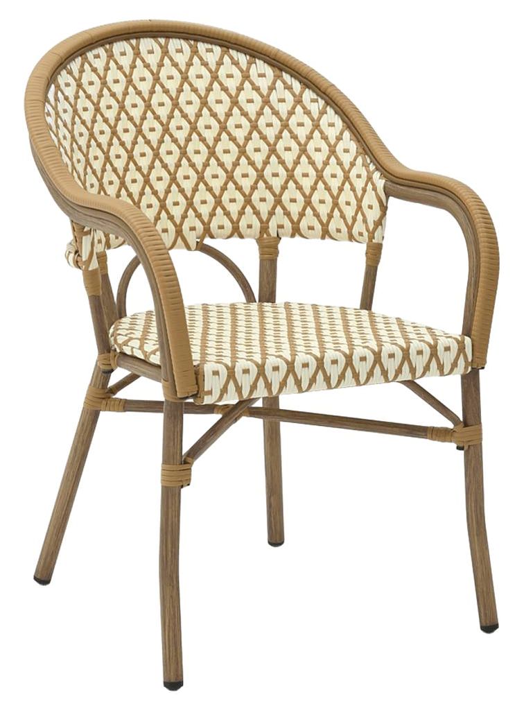 Плетенный стул во французском стиле для кафе, ресторана, веранды, террасы, отеля, гостиницы, дачи, летней площадки, загородного дома. Каркас алюминий крашенный под бамбук, сиденье и спинка текстилен бежевого цвета. Размеры: Ширина 47 см, Высота 88 см, Глубина 57 см, Высота сиденья 46 см, Вес 3,4 кг.